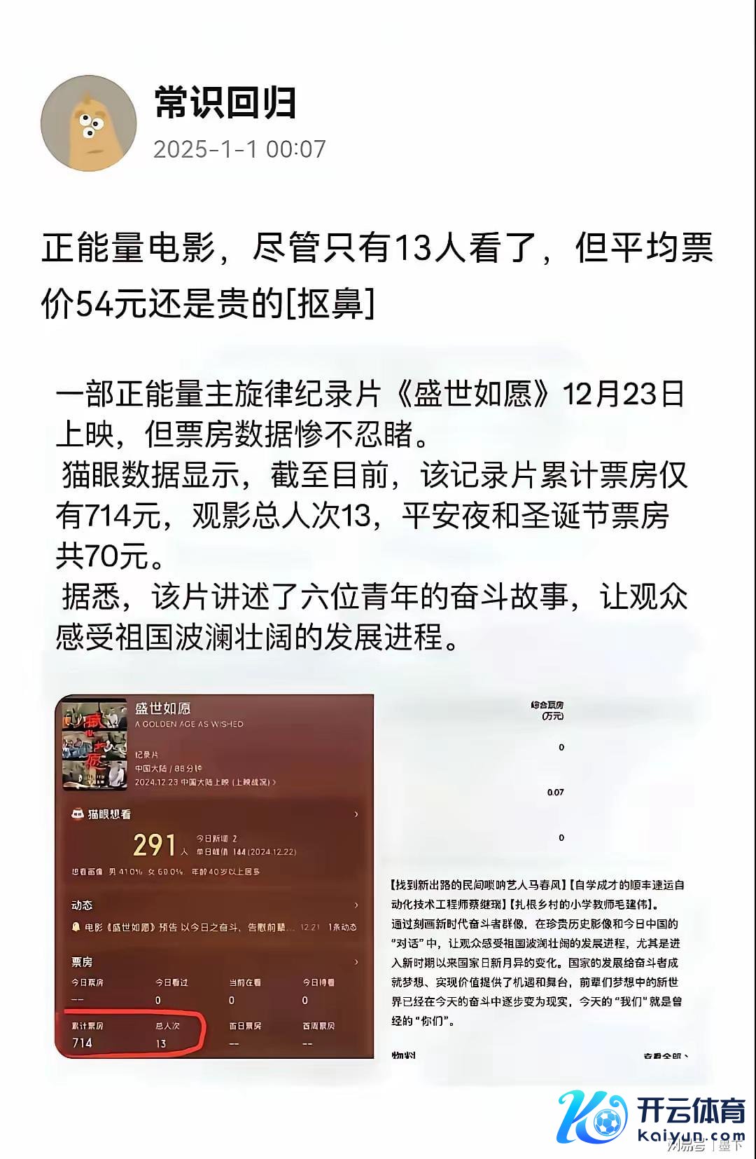 发现没?电影圈的风向确切变了!往常那种充满正能量、广泛叙事立场的主旋律电影,如今在票房和排片上碰到了前所未有的“隆冬”。就说最近有部主旋律电影吧,票房收货那叫一个目不忍见,只是唯有13个东说念主孝顺了票房kaiyun.com,思看的东说念主数也三三两两,不到300东说念主,而在北京这样的文化中心,尽然莫得一家电影院高慢给它排片。这放在几年前,几乎是无法思象的事情。思思依然,吴京的战狼系列那然而火遍大江南北,每一部王人激发不雅影上升,不雅众们热心激越,影院里济济一堂。 那为什么咫尺会变成这样呢?