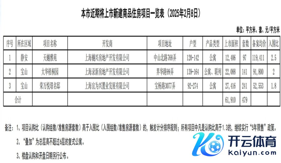 2月8日,据“网上房地产”公示音尘,上海近期将上市3个新建商品住房名堂,1处在静安区、2处在宝山区,可提供479套房源,共约61910平素米,1个10万+楼盘。