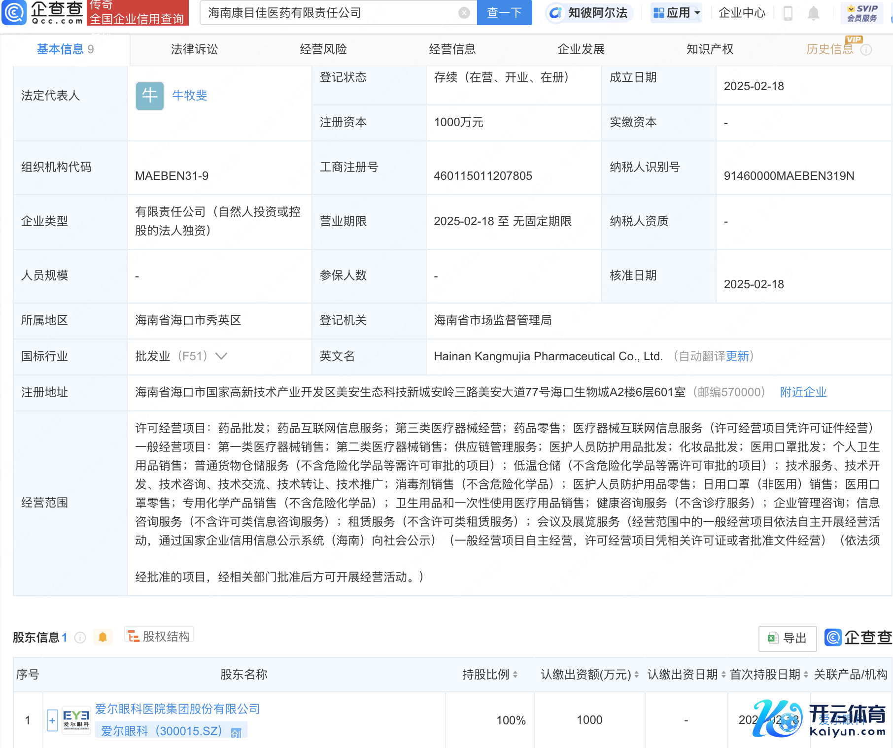 企查查APP表现kaiyun官方网站,近日,海南康目佳医药有限职守公司成立,法定代表东说念主为牛牧斐,注册成本1000万元,认识范围包含:药品互联网信息干事;第三类医疗器械认识;药品零卖;供应链解决干事等。企查查股权穿透表现,该公司由爱尔眼科(300015)全资合手股。